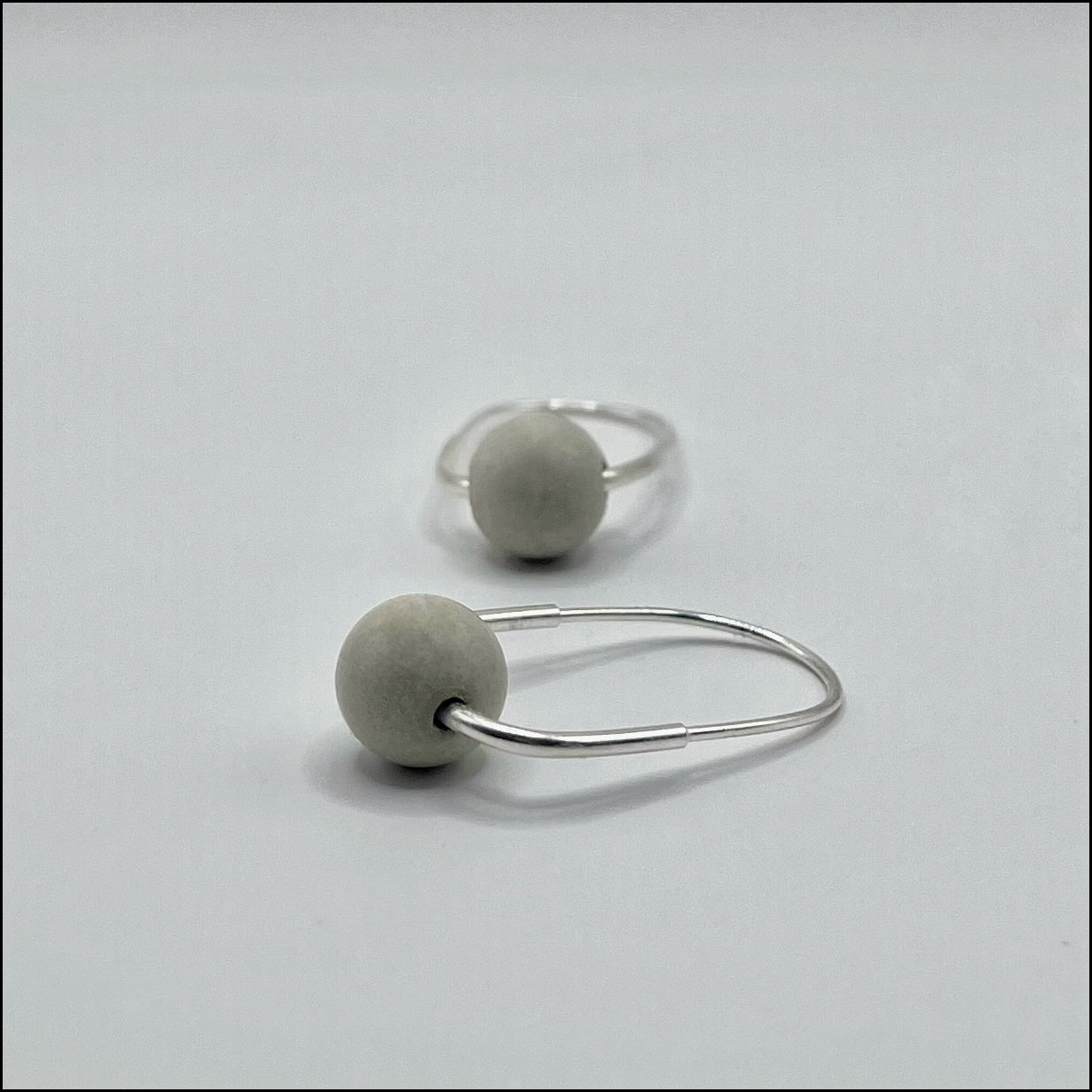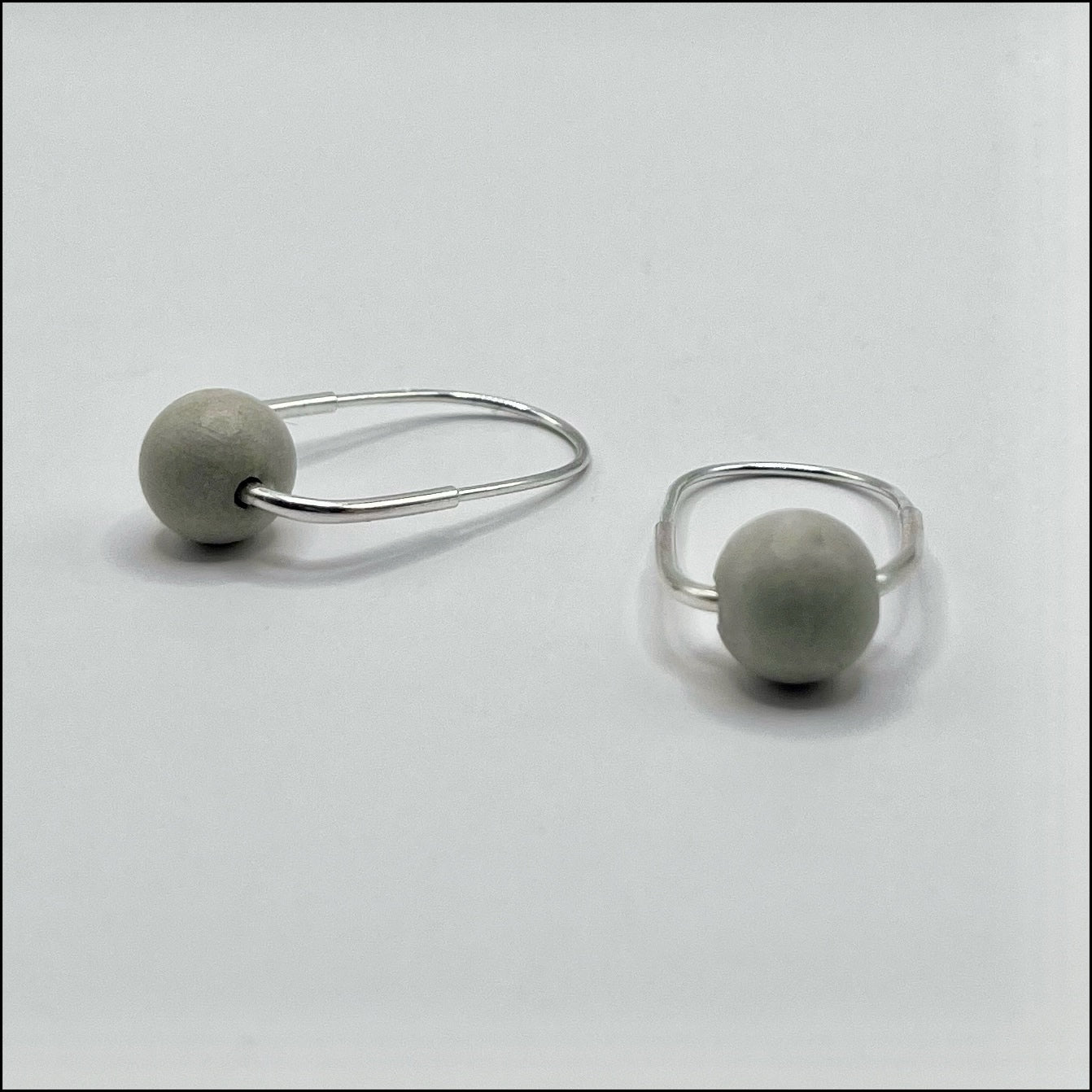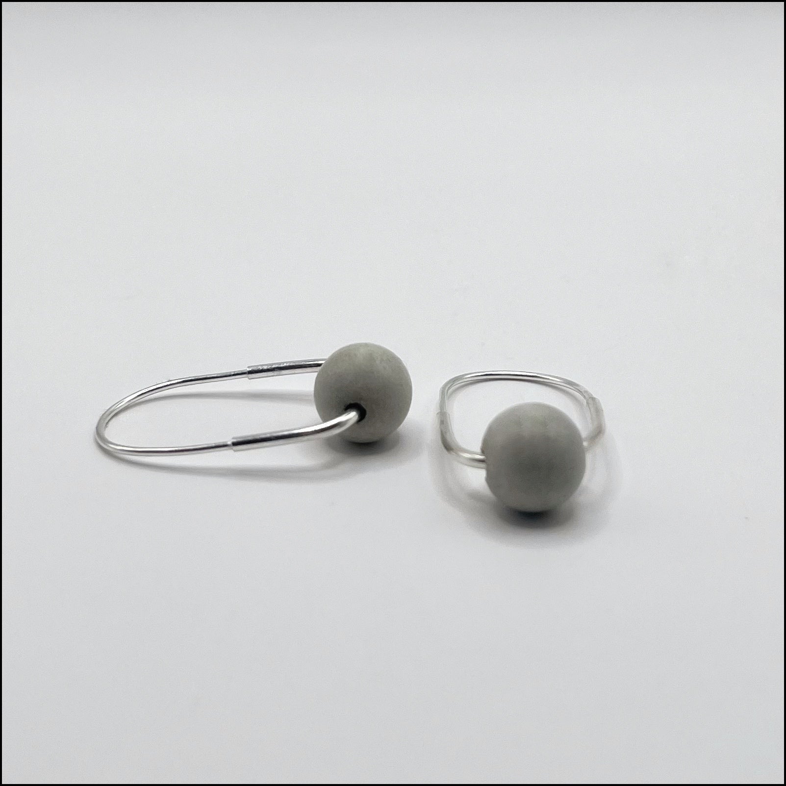 The Callisto earring features a graceful oval silver hoop accented by a sleek concrete sphere, blending refined elegance with contemporary edge.