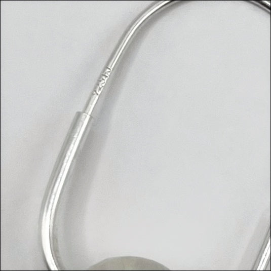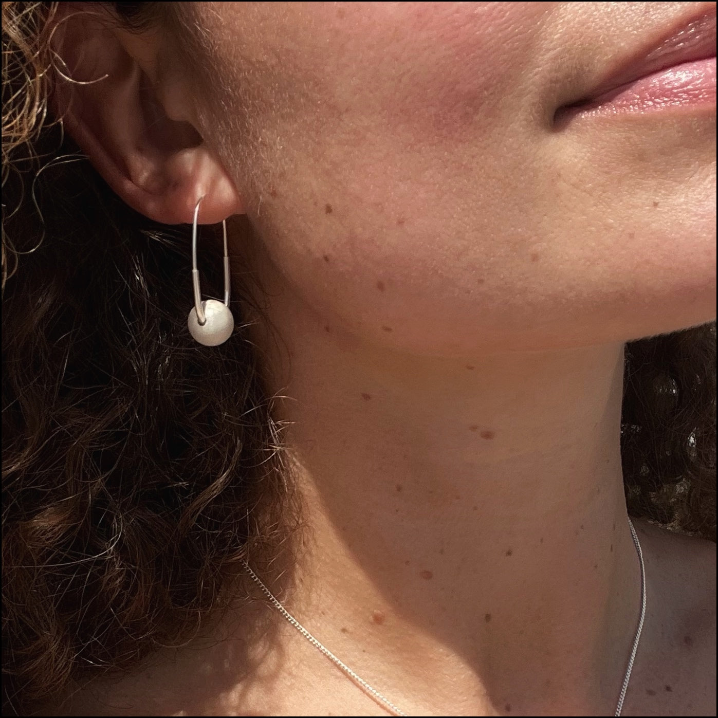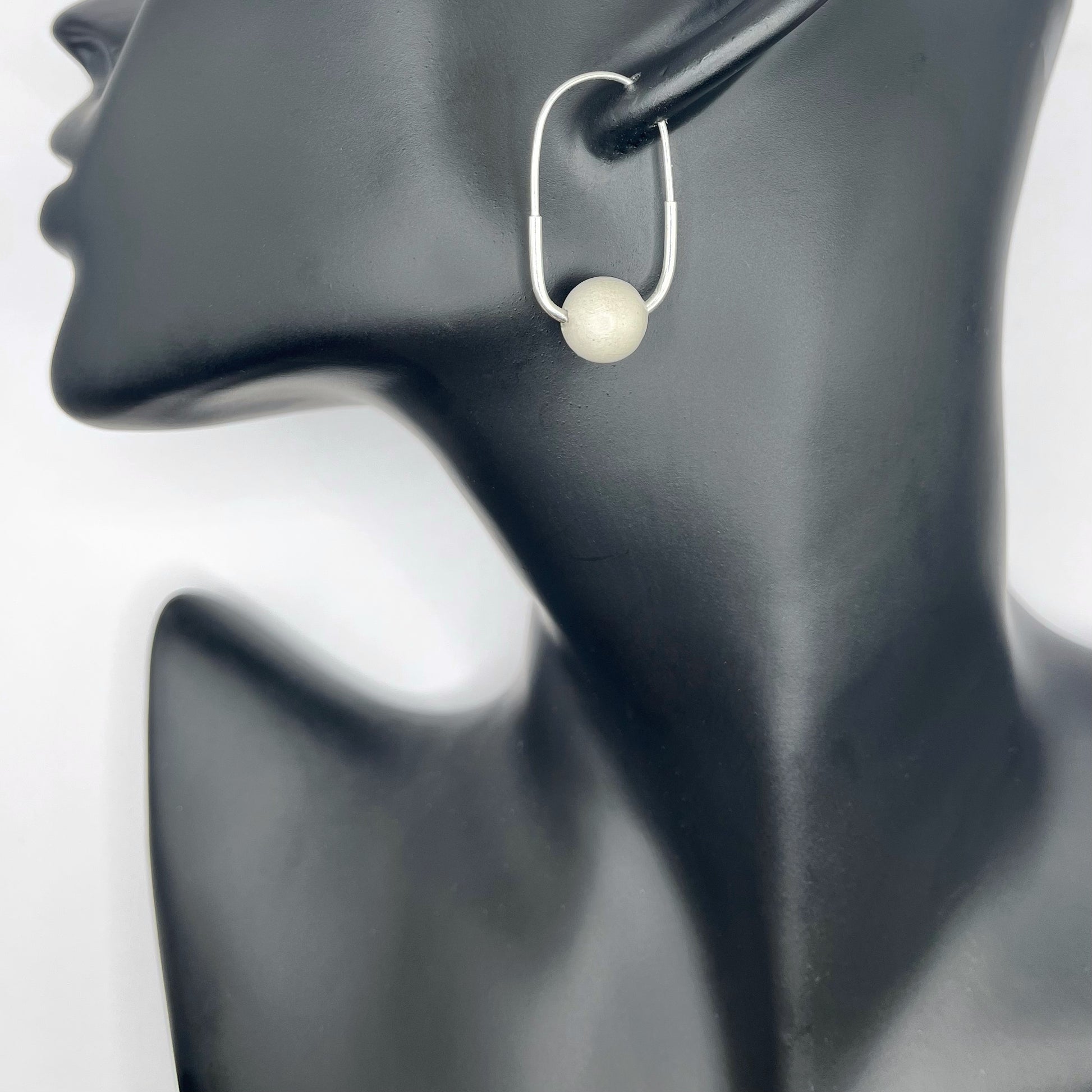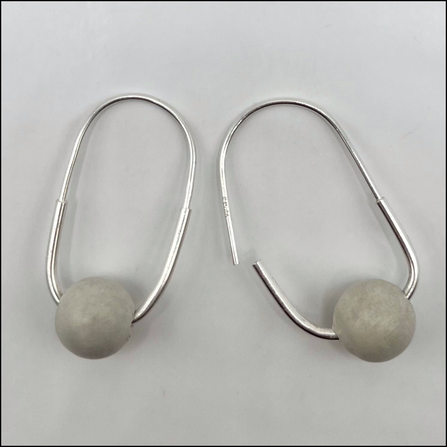 The Callisto earring features a graceful oval silver hoop accented by a sleek concrete sphere, blending refined elegance with contemporary edge.