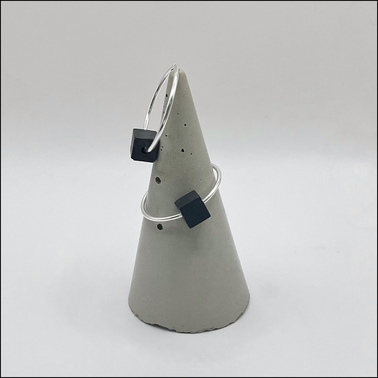 Minimalist hoop earrings crafted from 925 silver, each featuring a single handmade anthracite concrete cube suspended within the loop. The interplay of polished metal and raw concrete creates a striking contrast.